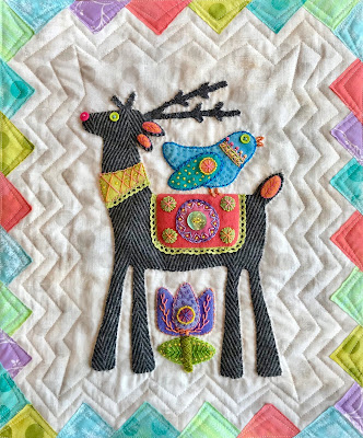 I rounded up the wool reindeers that members of the Woolies have made this winter. They're from a pattern shown above with the red bird, which is from a quilt store in Bellingham whose name escapes me.