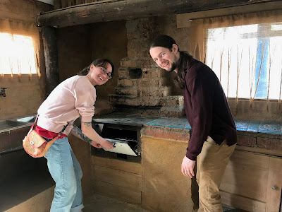 Above is his chapel. Below, Julia and Jade check out the kitchen in his adobe home.