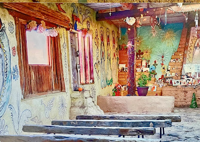 Here is his adobe Chapel In the Sun, an open roof building with his colorful murals on the interior walls and narrow rough-hewn benches.