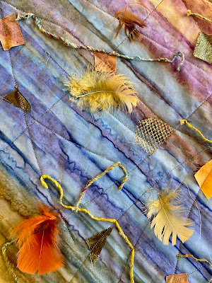My "Canyon Wind" art quilt was inspired by my hikes at the Grand Canyon. As the sun sets, wind swirling with feathers, sand, bits of brush and light dances up from the canyon. Sunset colored striated fabric is arranged diagonally to add energy and motion. Gold quilting catches feathers, yarn, and snippets of fabric, giving a three-dimensional effect. Gold metallic thread and fabric catch and reflect the light. Hanging sleeve on back.